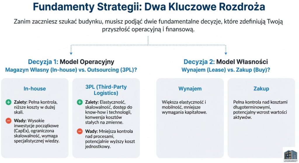 Na tym fundamentalnym poziomie firma musi zdecydować o podstawowym modelu operacyjnym swojej logistyki magazynowej. Wybór między samodzielnym zarządzaniem a outsourcingiem determinuje poziom kontroli, elastyczności i zaangażowania kapitałowego.