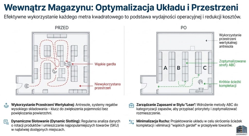 5. Optymalizacja Wykorzystania Przestrzeni (Space Utilization): Efektywny magazyn maksymalizuje wykorzystanie swojej kubatury, a nie tylko powierzchni podłogi. Należy ocenić, jak obiekt wykorzystuje przestrzeń wertykalną, np. poprzez systemy regałów wysokiego składowania, co pozwala na przechowywanie większej ilości towaru na mniejszej powierzchni.