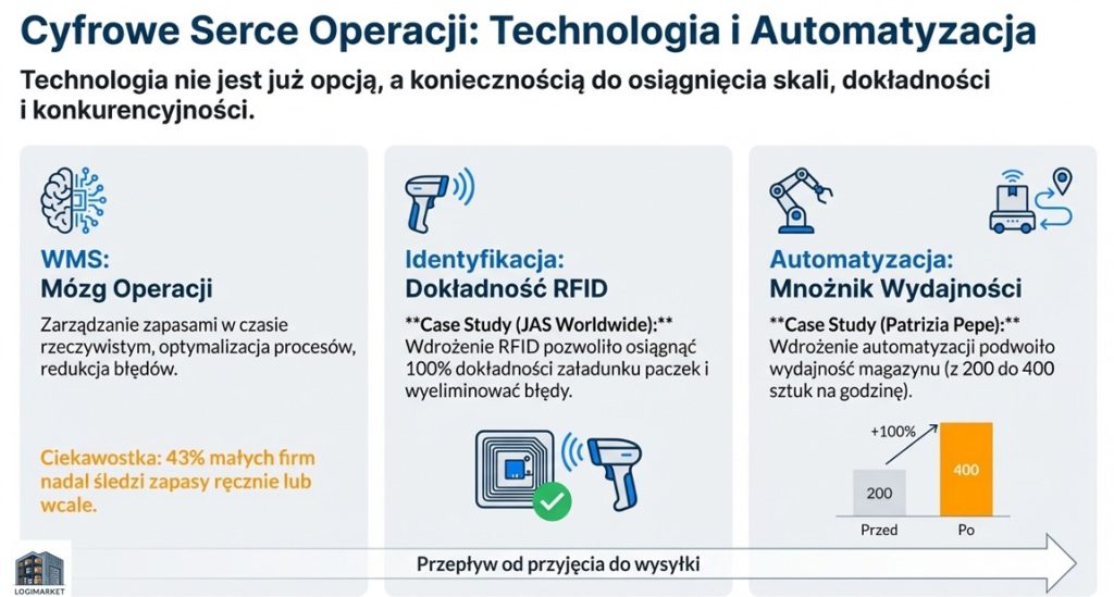 Wydajność operacyjna magazynu jest zdefiniowana przez jego wewnętrzne procesy i wspierające je technologie. Kluczowe procesy, takie jak przyjęcie towaru (receiving), składowanie (storage), kompletacja (picking), pakowanie (packing) i wysyłka (shipping), muszą tworzyć spójny i logiczny przepływ. Fundamentem nowoczesnego magazynu jest integracja technologiczna, która automatyzuje przepływ informacji i minimalizuje ryzyko błędów. Kluczowe systemy to WMS (Warehouse Management System), ERP (Enterprise Resource Planning) oraz TMS (Transportation Management System).