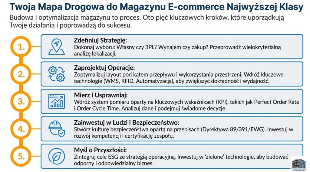 Wybór magazynu dla e-commerce to wielowymiarowa, strategiczna decyzja, która daleko wykracza poza prostą analizę kosztów. To decyzja, która kształtuje doświadczenie klienta, definiuje zdolność firmy do skalowania i buduje jej odporność na przyszłe wstrząsy rynkowe. Zastosowanie przedstawionych narzędzi – piramidy decyzyjnej, 20 kryteriów i checklisty weryfikacyjnej – w połączeniu z rosnącą wagą aspektów ESG, pozwoli firmom e-commerce zbudować wydajny, skalowalny i odpowiedzialny łańcuch dostaw. To fundament, który nie tylko sprosta dzisiejszym wymaganiom, ale również zapewni gotowość na wyzwania przyszłości.