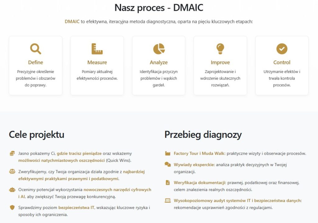 - Projekt usprawnień procesów i przepływów (organizacja pracy, standaryzacja, KPI).