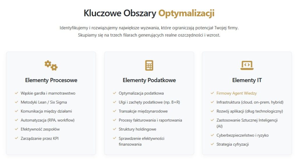 W praktyce oznacza to porządkowanie procesów biznesowych w tym produkcyjnych, magazynowych, informatycznych, zakupowych i innych kluczowych dla organizacji. Celem nadrzędnym jest wygenerowanie oszczędności, podniesienie produktywności i jakości. Dzięki takiemu podejściu oraz wdrożeniom narzędzi IT, które realnie ułatwiają zarządzanie biznesem (integracje, cyfryzacja, WMS/TMS/ERP) nasze projekty są realizowane skutecznie a wyniki prac są trwałe. Budujemy również automatyzacje oparte o AI, szczególnie tam, gdzie organizacja „traci czas na dokumenty” i ręczne przepisywanie danych. Kluczowym uzupełnieniem jest wsparcie prawno‑podatkowe, które pomaga podejmować bezpieczne decyzje i spinać zmiany operacyjne z wymaganiami formalnymi.