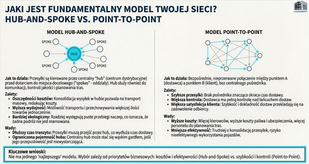 Na najwyższym poziomie architekturę sieci można sprowadzić do dwóch fundamentalnych modeli. Model Hub-and-Spoke (piasta i szprychy) wykorzystuje centralne centrum dystrybucyjne (hub) do konsolidacji towarów przed ich dalszą wysyłką do poszczególnych lokalizacji (szprych). Z kolei model Point-to-Point (punkt-punkt) polega na bezpośrednich wysyłkach od dostawcy (lub punktu początkowego) do klienta (punktu końcowego), bez pośredniego centrum.