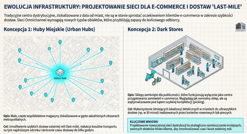 • Omnichannel: To podejście, które integruje wiele kanałów sprzedaży (np. sklep stacjonarny, sklep internetowy, aplikacja mobilna) w celu zapewnienia klientom „płynnego i ujednoliconego doświadczenia zakupowego”. Oznacza to na przykład możliwość zamówienia produktu online i odebrania go w sklepie, czy zwrotu towaru kupionego w internecie w dowolnym punkcie stacjonarnym. Sieć dystrybucji musi być na tyle elastyczna, aby obsłużyć te zróżnicowane ścieżki zamówień.